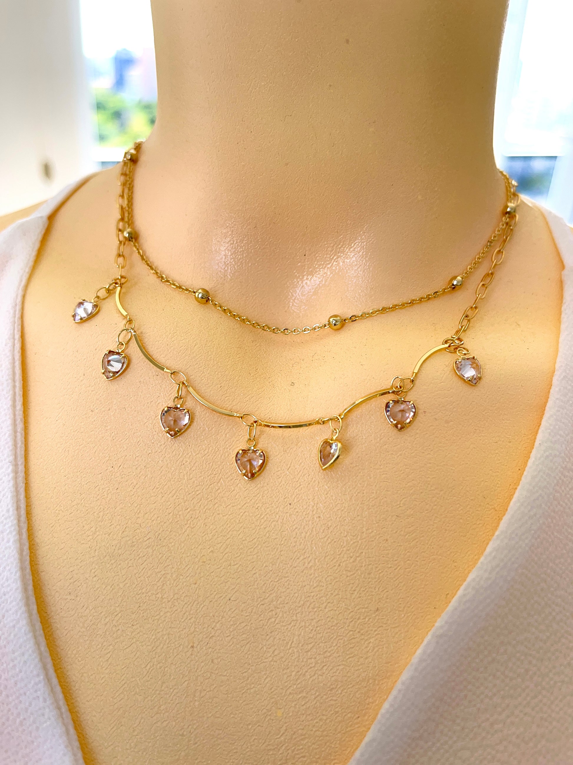 Zirkon taşların ışıltısıyla parlayan bu iki sıralı kolye, kalp detaylarıyla duygusal bir dokunuş sunuyor.