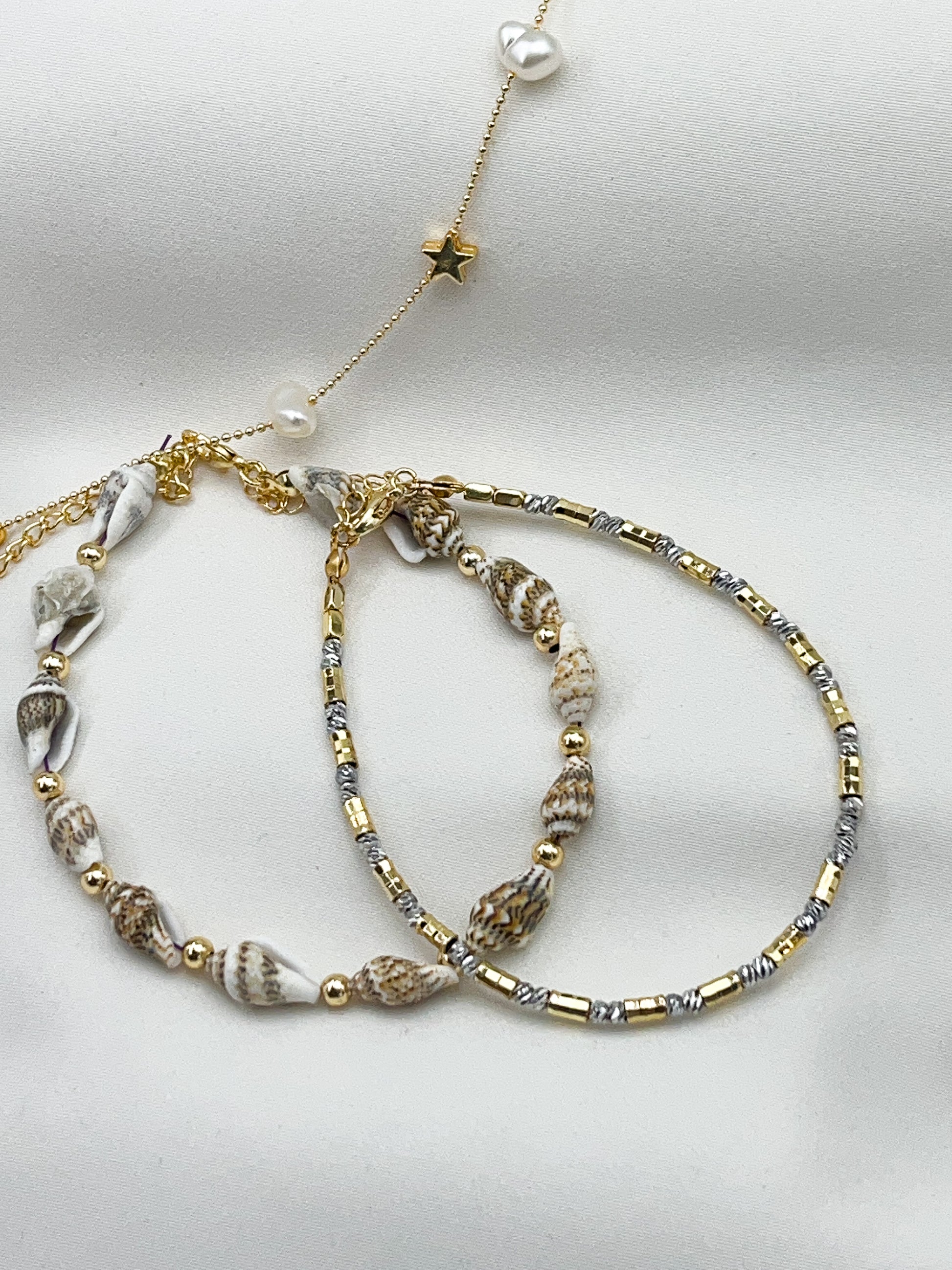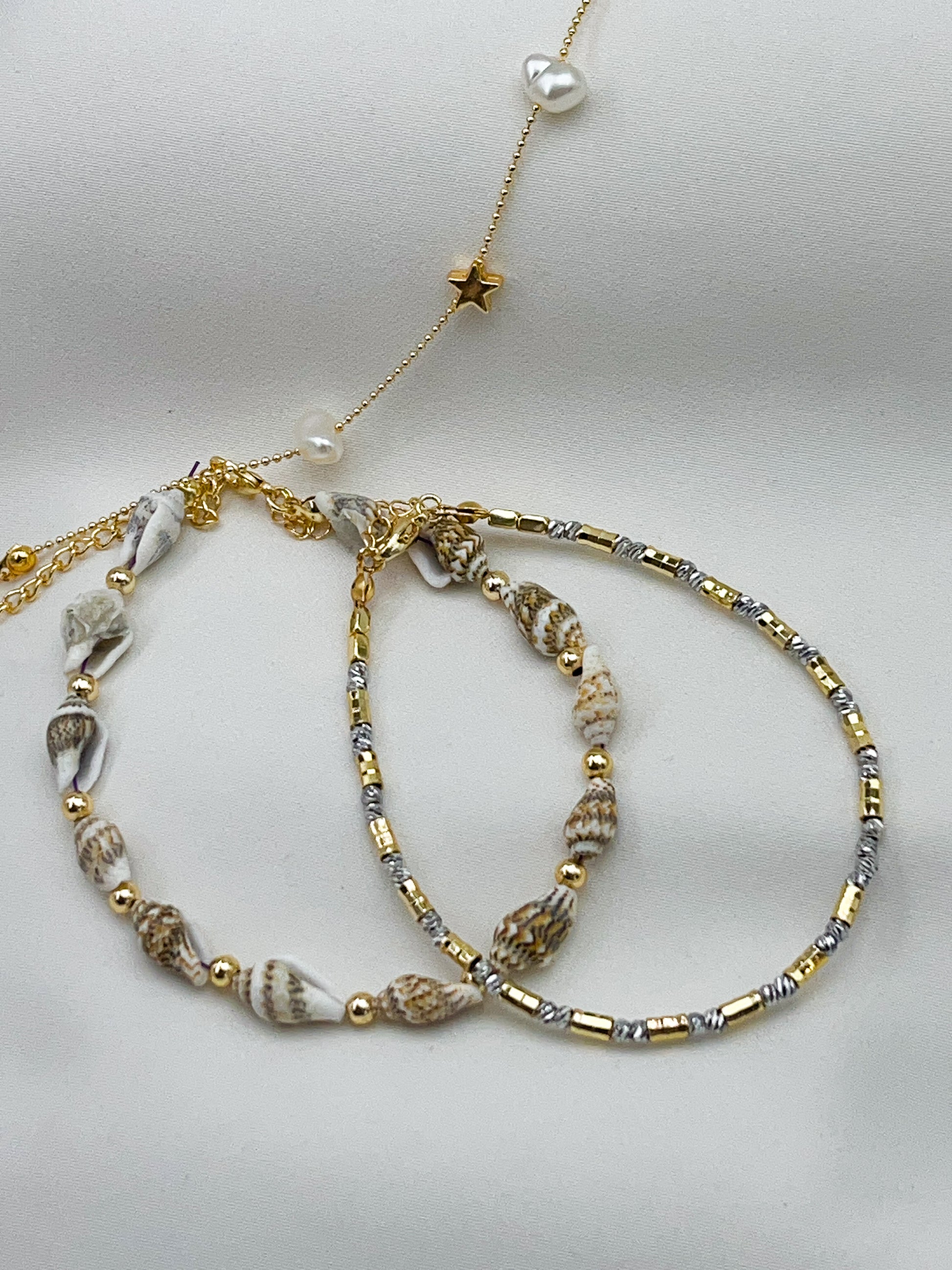 Gold ve silver detayların doğal deniz kabuklarıyla buluştuğu bu halhal seti, yaz stilinize doğal bir şıklık katıyor! Sahil esintisini her adımda hissettiren bu özel tasarım, hem plaj kombinlerine hem de günlük yazlık kıyafetlere mükemmel uyum sağlar.