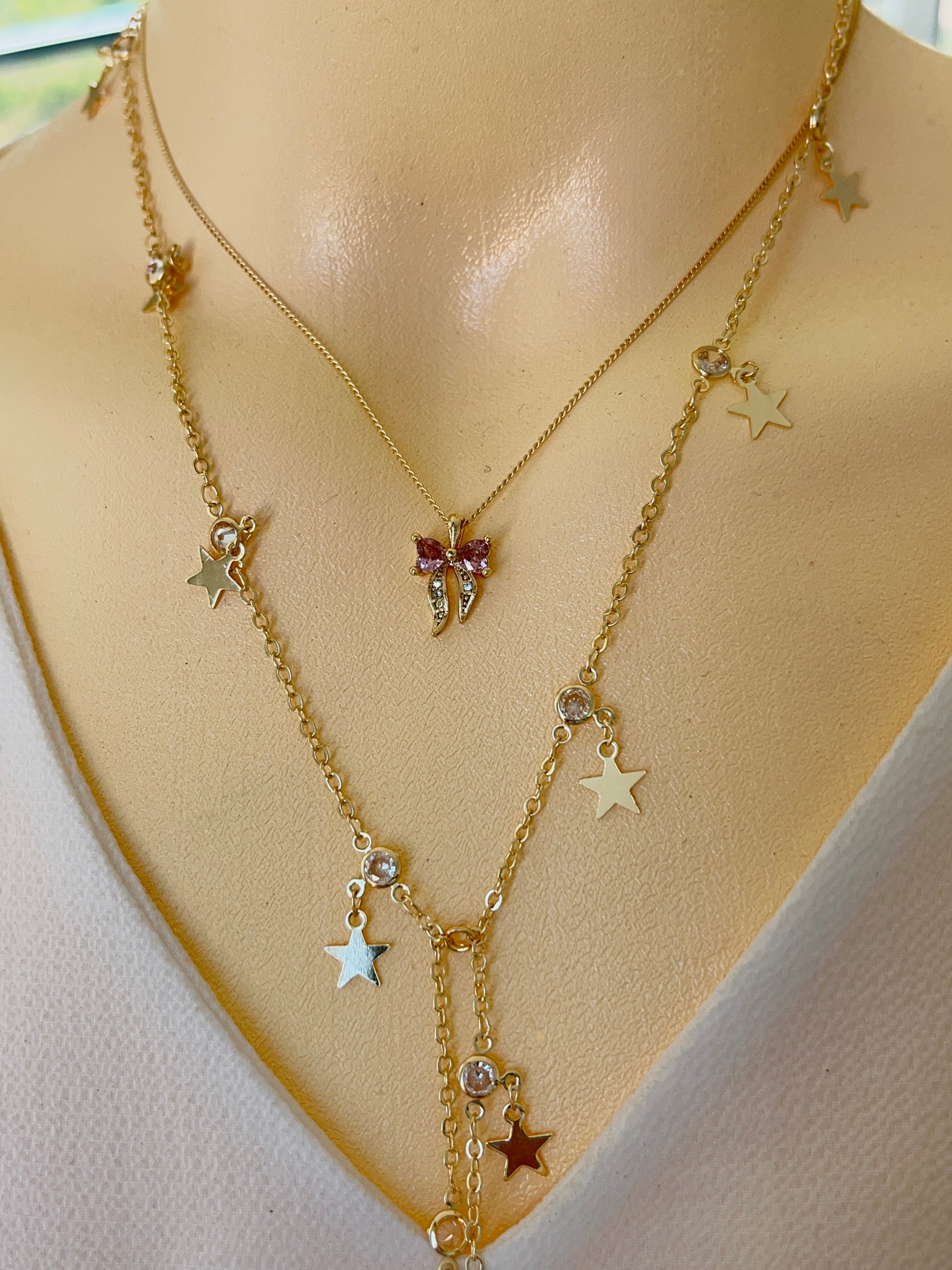 Biri pembe fiyonk detayı ve ışıltılı zirkon taşıyla feminen bir dokunuş sunarken, diğeri yıldız detaylı tasarımıyla gökyüzünün ışıltısını dekoltenize taşıyor.