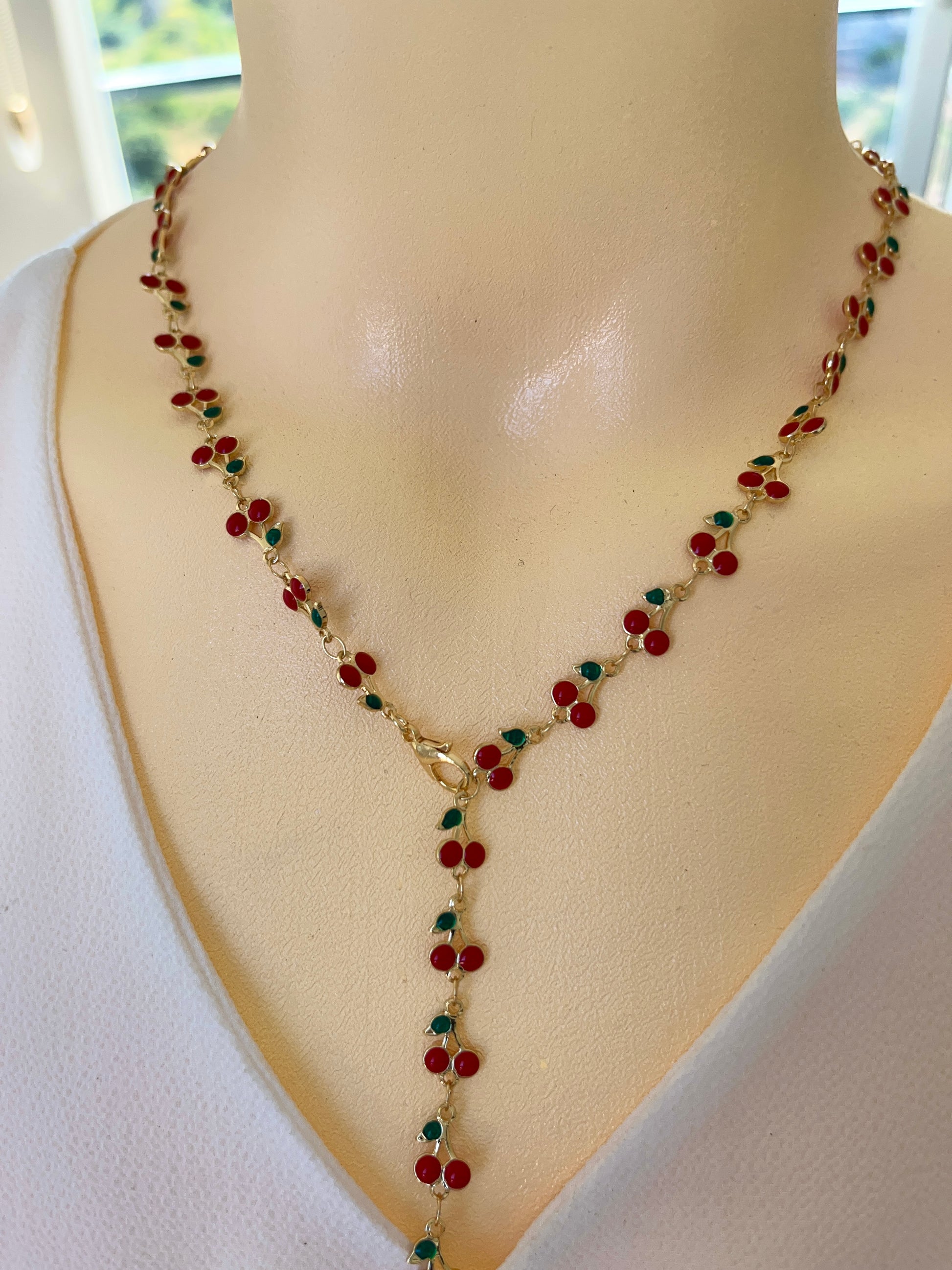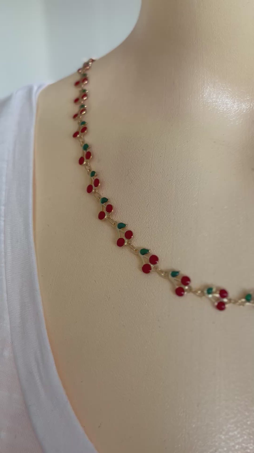 Gold rengin sıcak ışıltısı ve cherry detayın enerjisiyle tasarlanan bu dekolte kolye, 65 cm uzunluğu sayesinde zarifçe süzülür ve dikkatleri üzerine çeker.