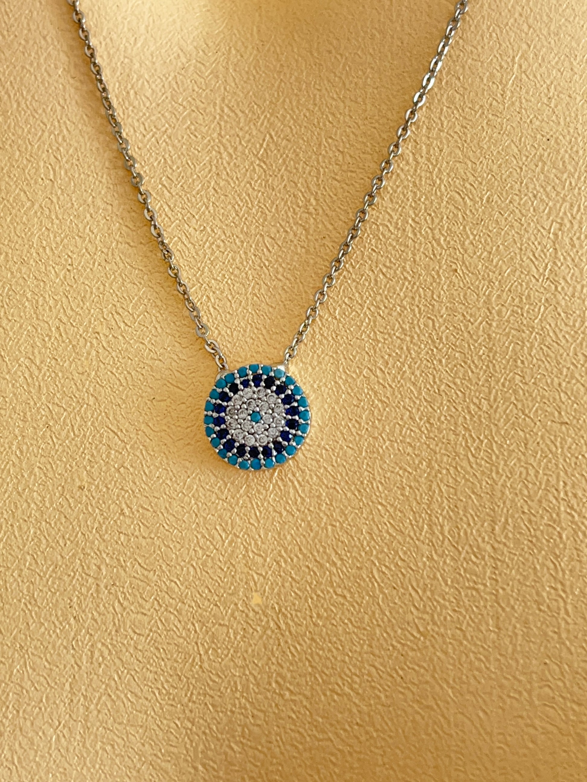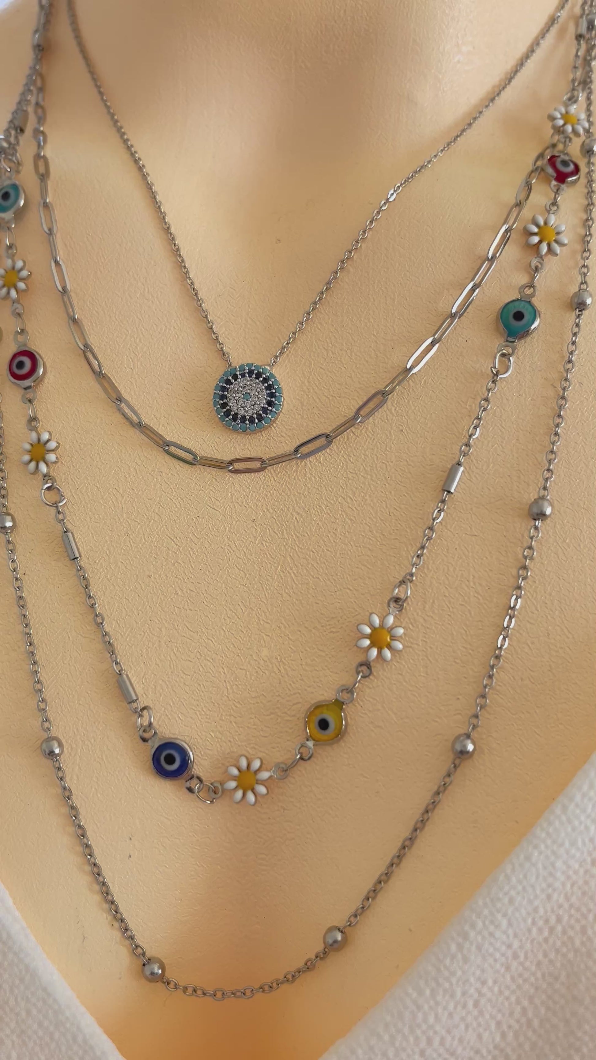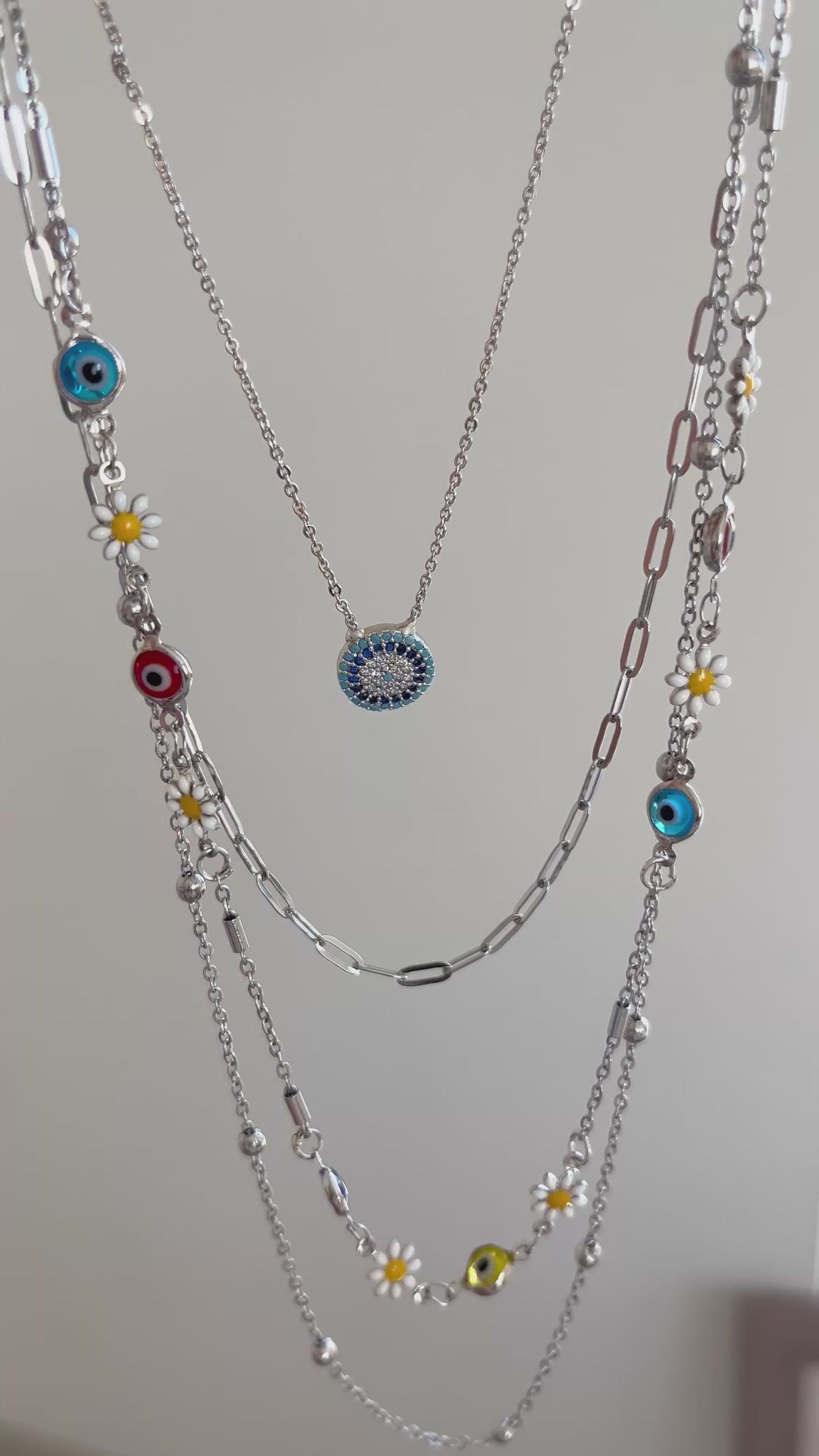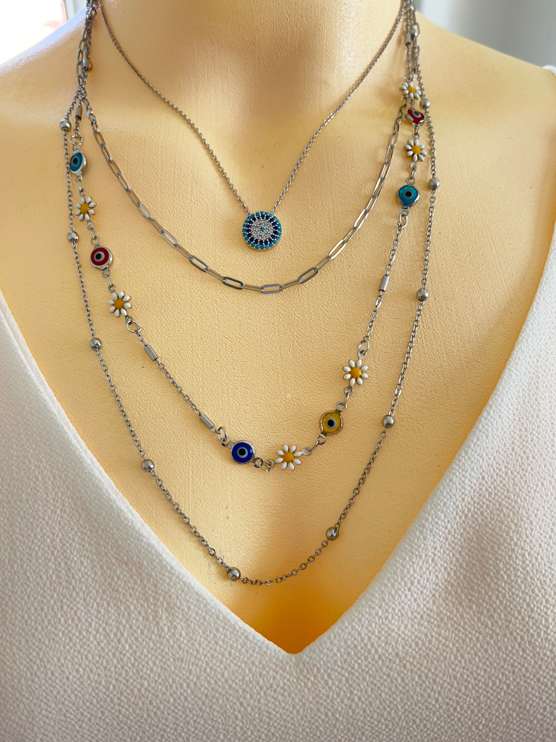 Dayanıklı çelikten üretilen bu kolye, papatya ve nazar boncuğu detaylarıyla hem zarif hem de koruyucu bir anlam taşır. Katmanlı zincir tasarımı sayesinde günlük kombinlerde modern bir hava katarken, özel günlerde de stilinizi tamamlar.