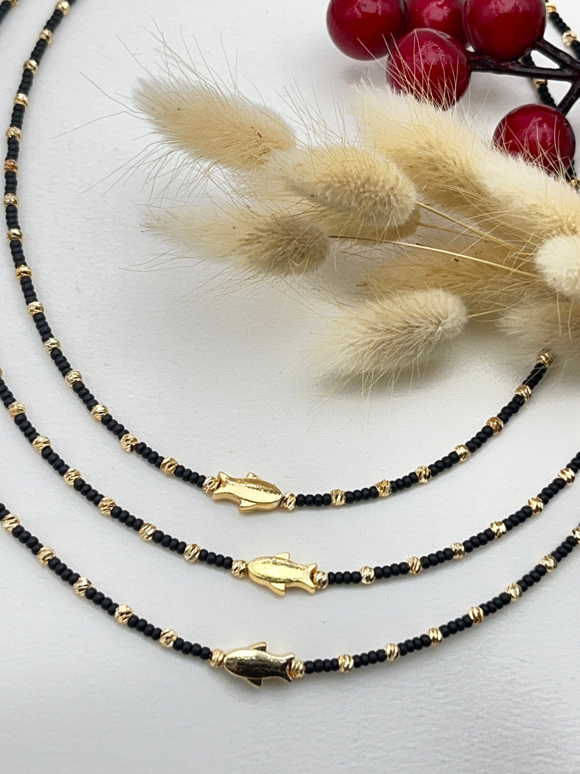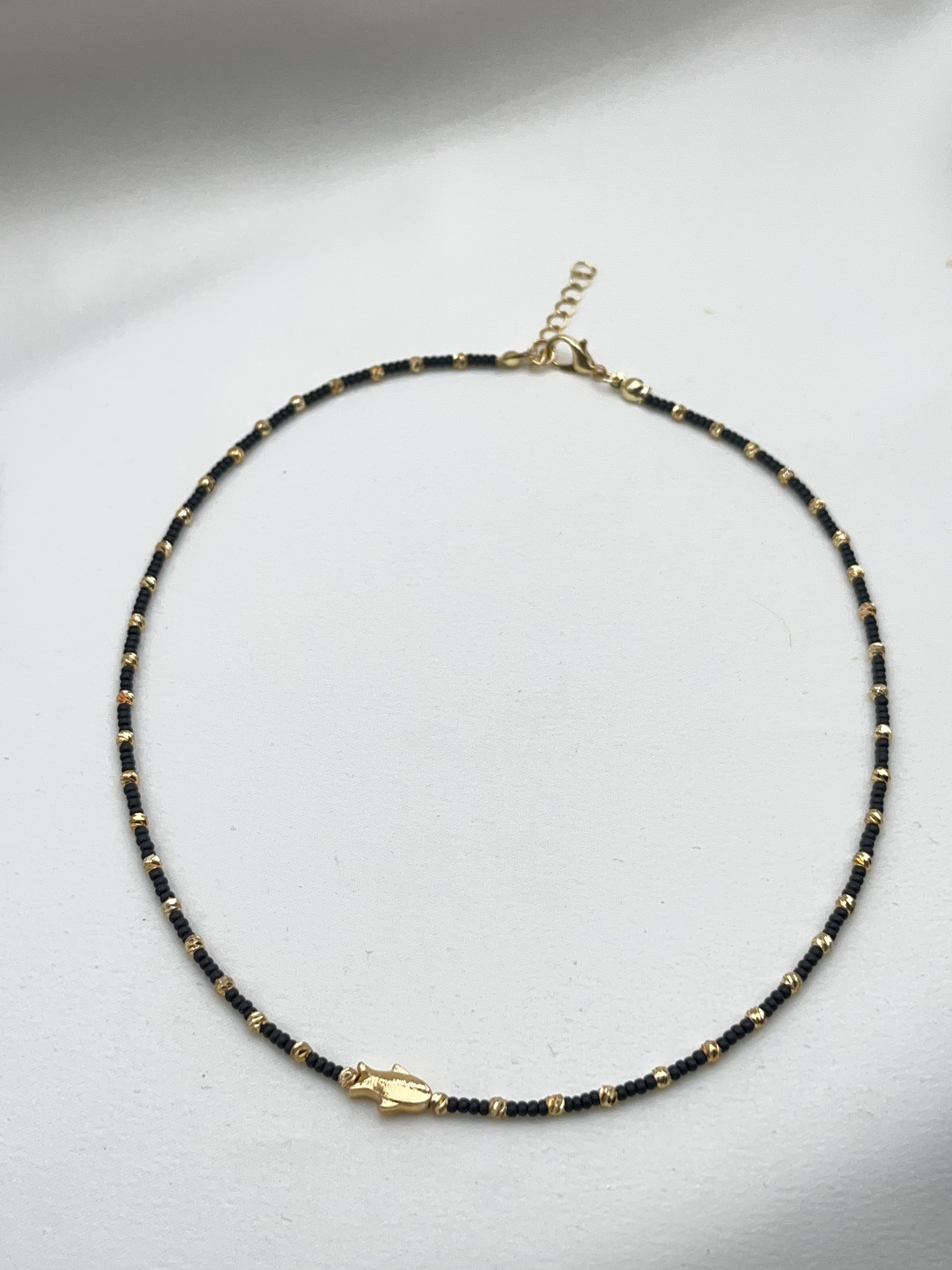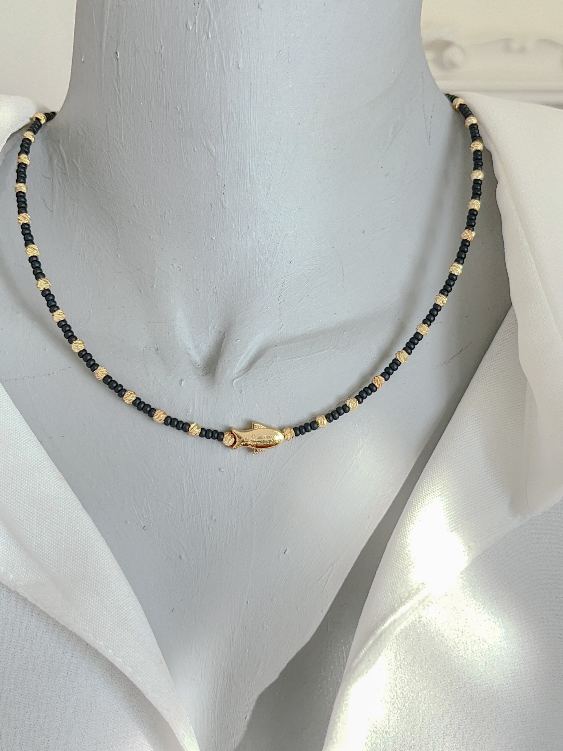Gold dorika boncuklar ve doğal taş ile hazırlanmış minimal kolye 40 +5 cm’dir