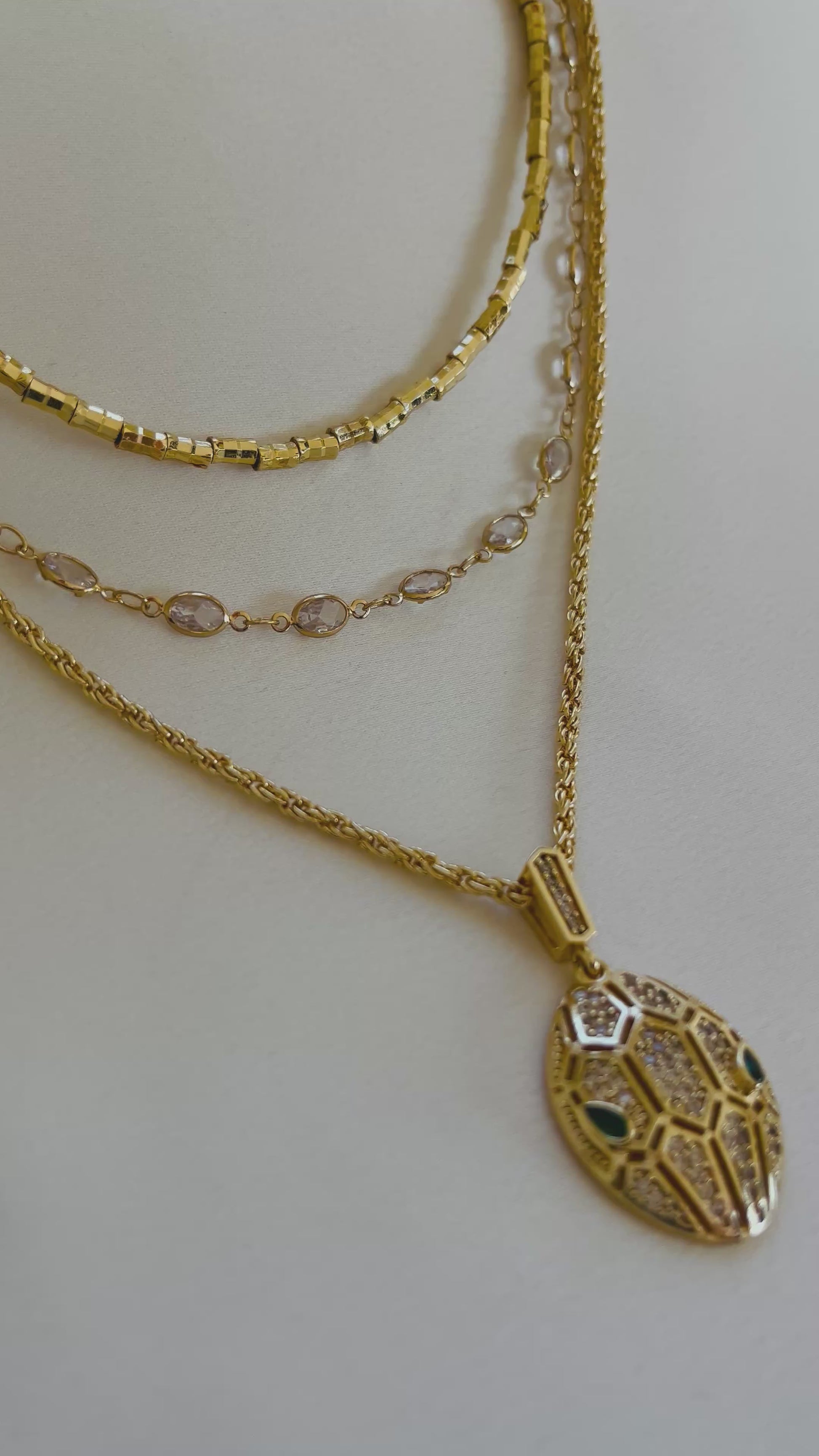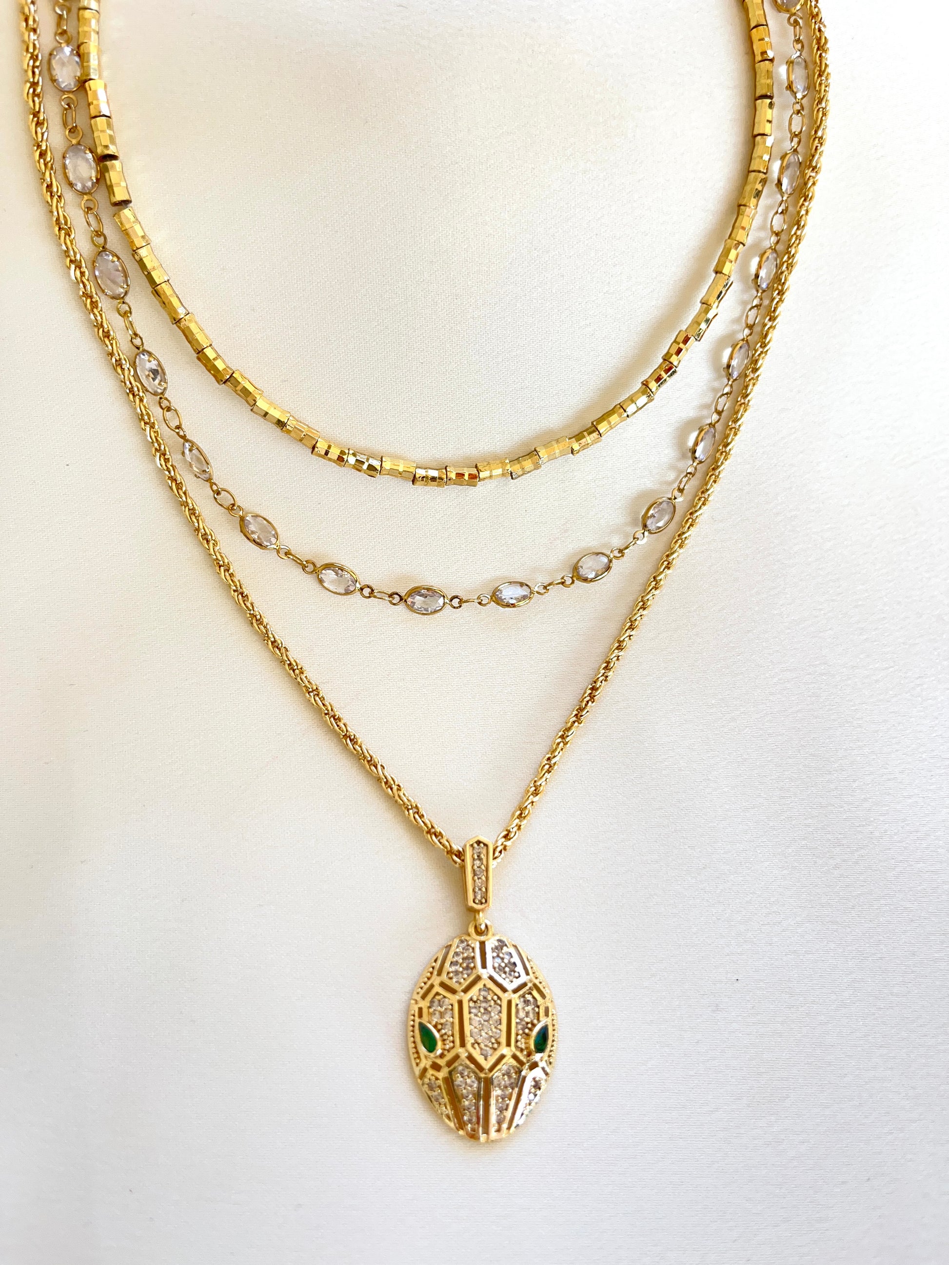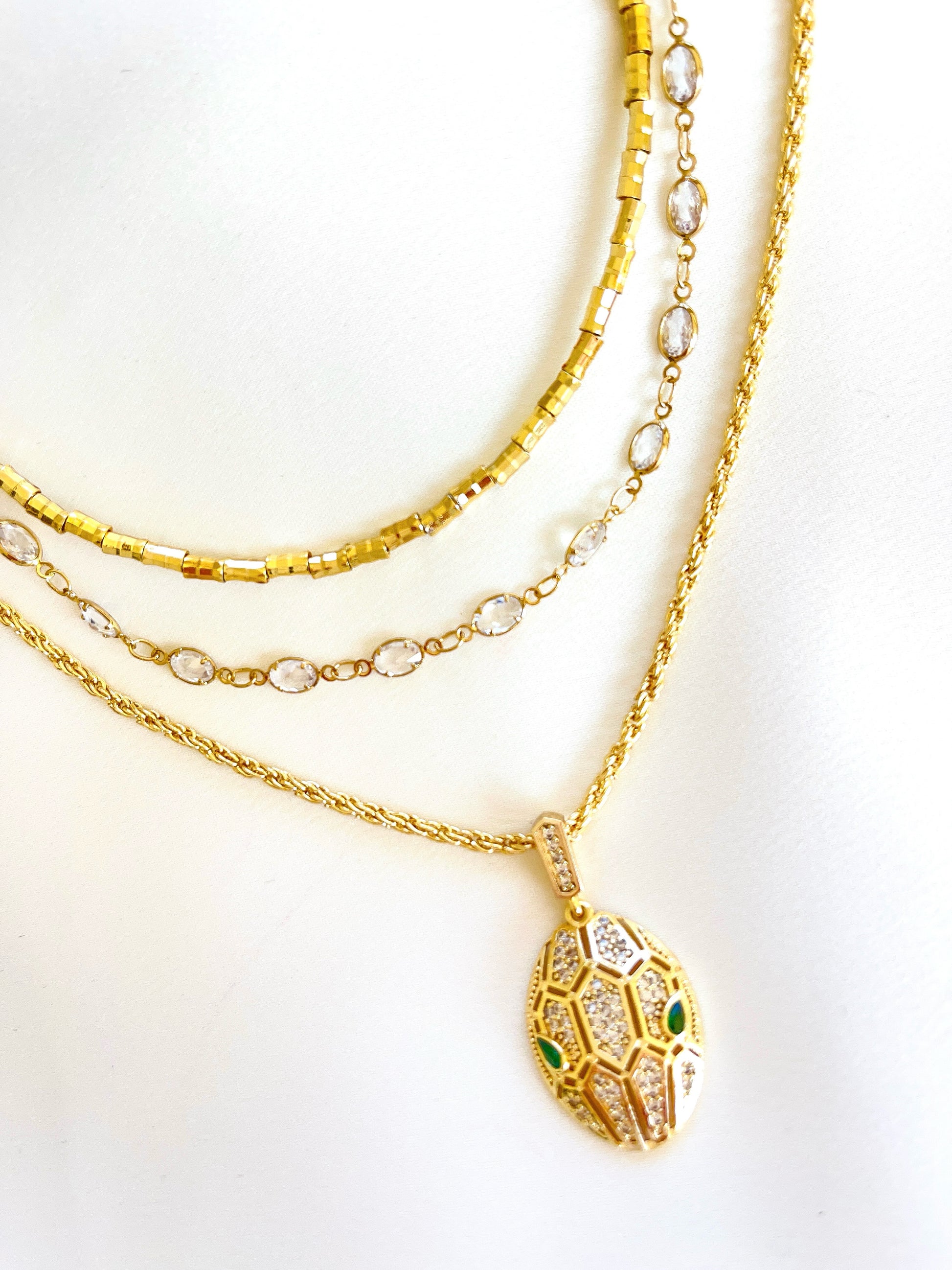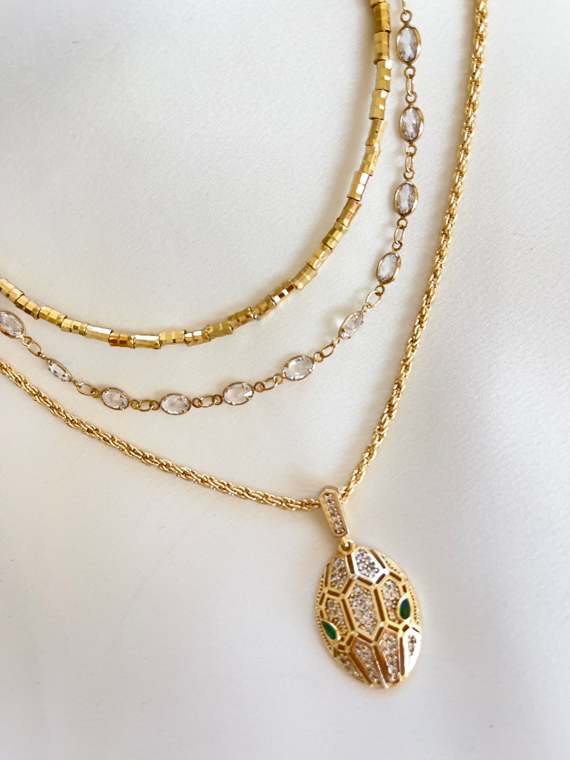 Üç ayrı kolyenin bir araya gelerek oluşturduğu büyüleyici bir uyum… Yılan başlığı detayıyla güç, zarafet ve gizem bu kombinle buluşuyor. Her biri tek başına da kullanılabilir ama birlikteyken etkisi çok daha çarpıcı.