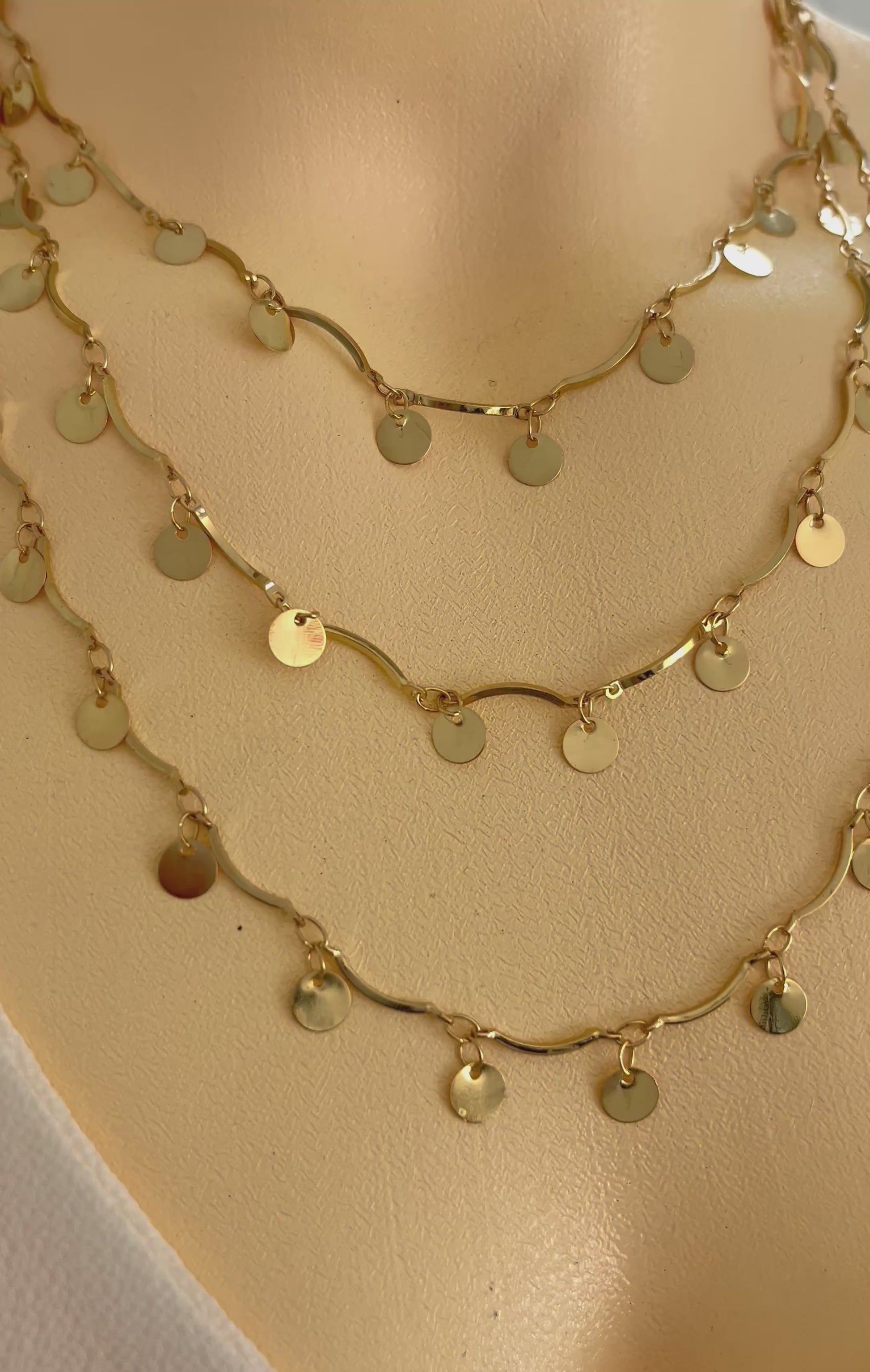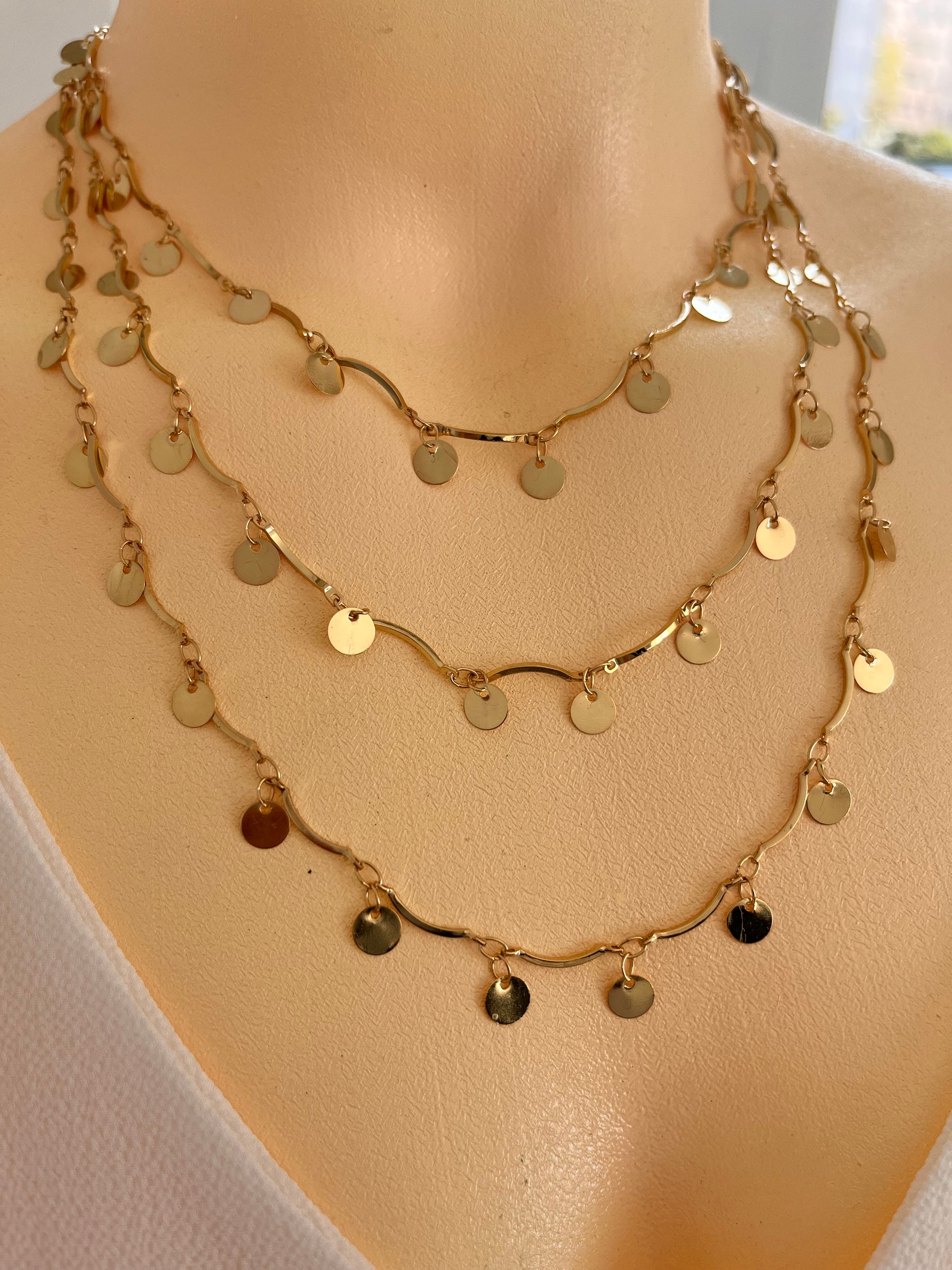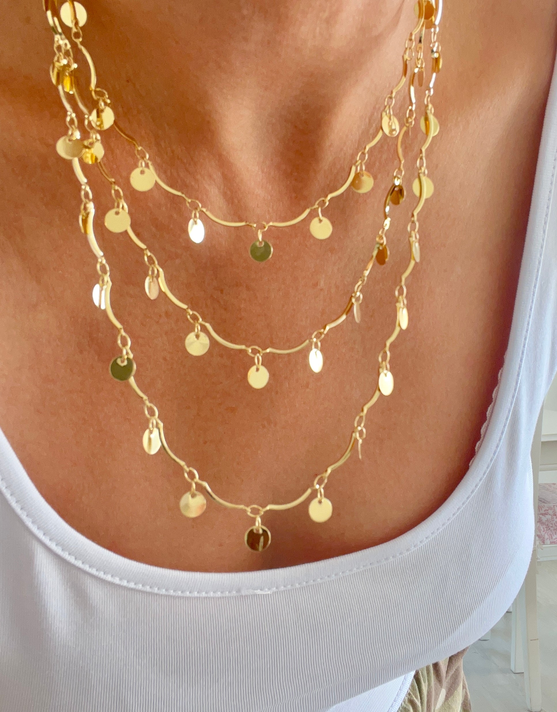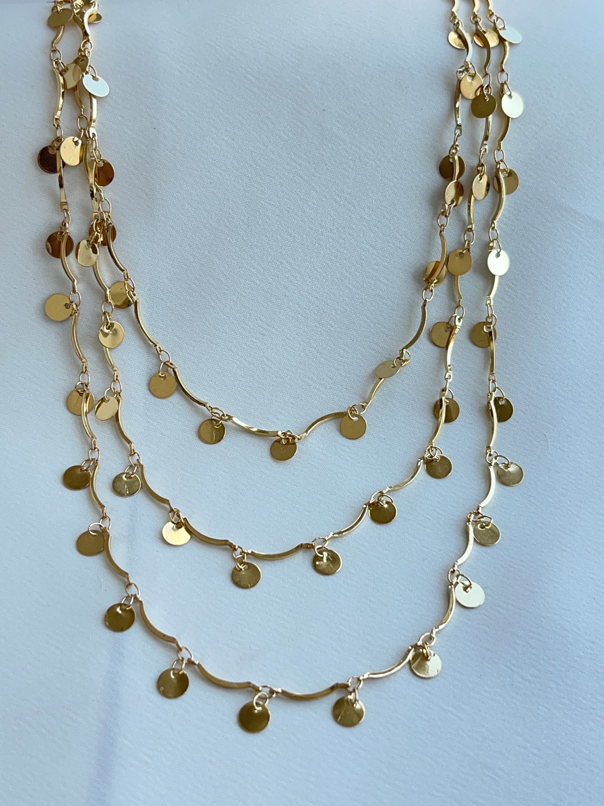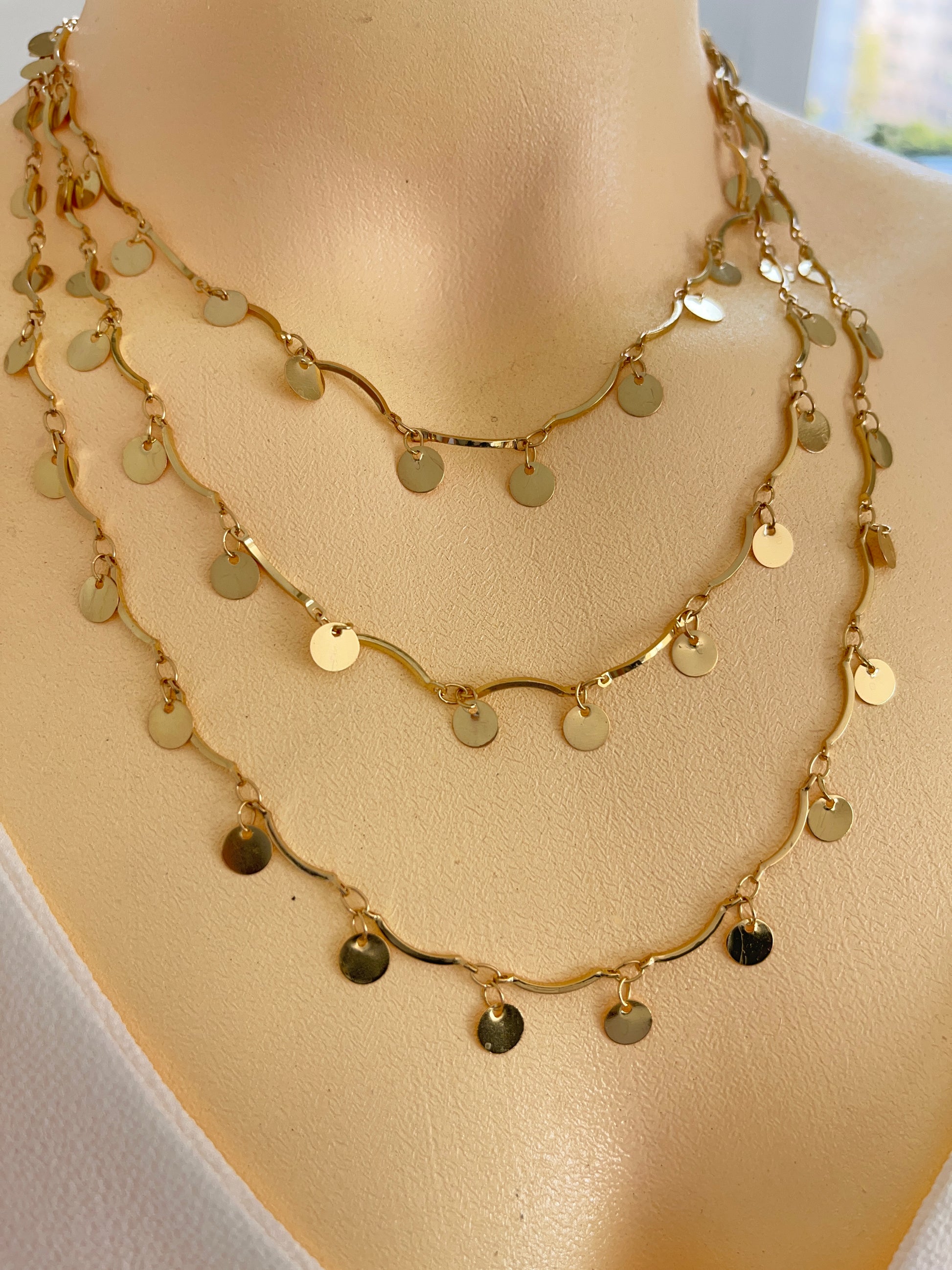 Üç sıralı pullarıyla dikkat çeken bu özel kolye, hem günlük kombinlerinize zarif bir dokunuş katar hem de özel günlerde şıklığınızı ön plana çıkarır. Katmanlı tasarımı sayesinde modern ve göz alıcı bir duruş sunar.